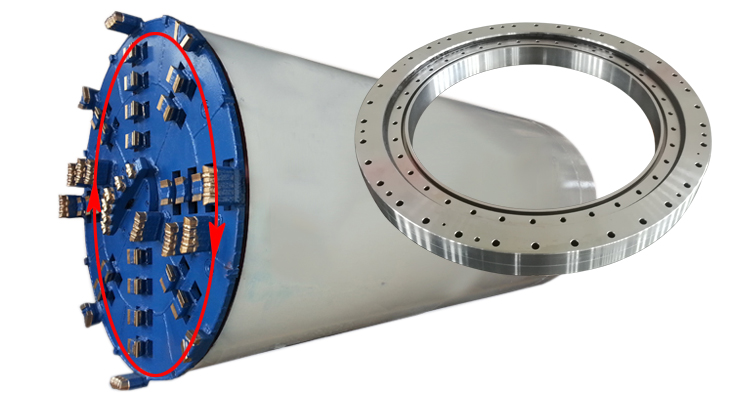 頂管機主要由旋轉挖掘系統(tǒng)、主頂液壓推進系統(tǒng)、泥土輸送系統(tǒng)、注漿系統(tǒng)、測量設備、地面吊裝設備和電氣系統(tǒng)等組成。我公司生產的頂管機專用三排圓柱滾子轉盤軸承(回轉支承)用于旋轉挖掘系統(tǒng)中的切削刀盤。